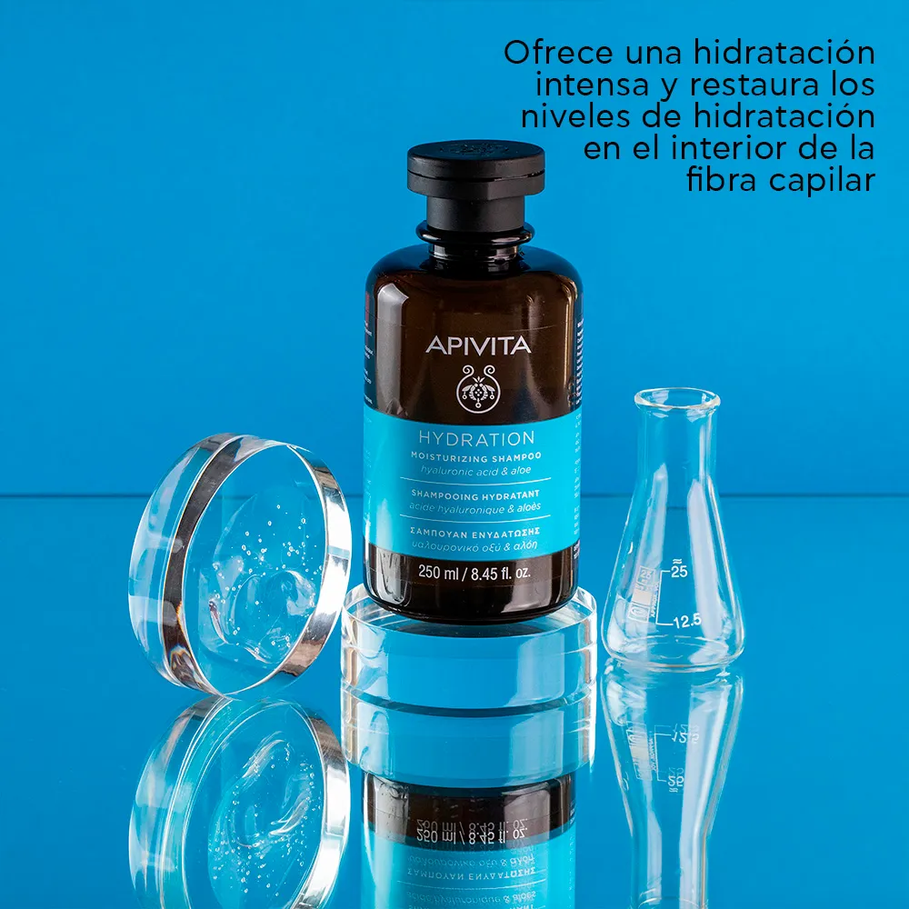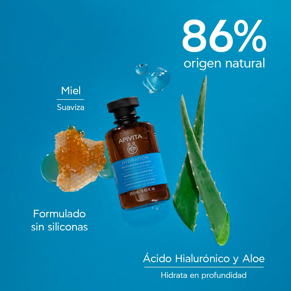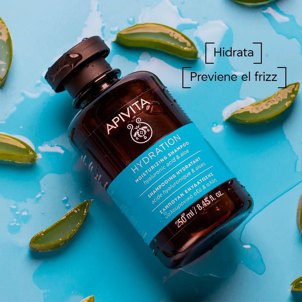 El shampoo hidratante de Apivita con ácido hialurónico y aloe limpia suavemente, conserva la humedad natural, previene el frizz y deja el cabello suave, brillante y saludable.