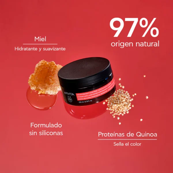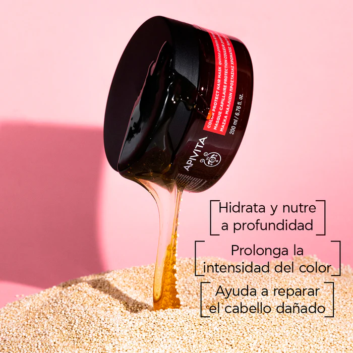 Mascarilla capilar nutritiva para cabello teñido con quinoa, miel y propóleo. Protege, repara y prolonga la intensidad y brillo del color.