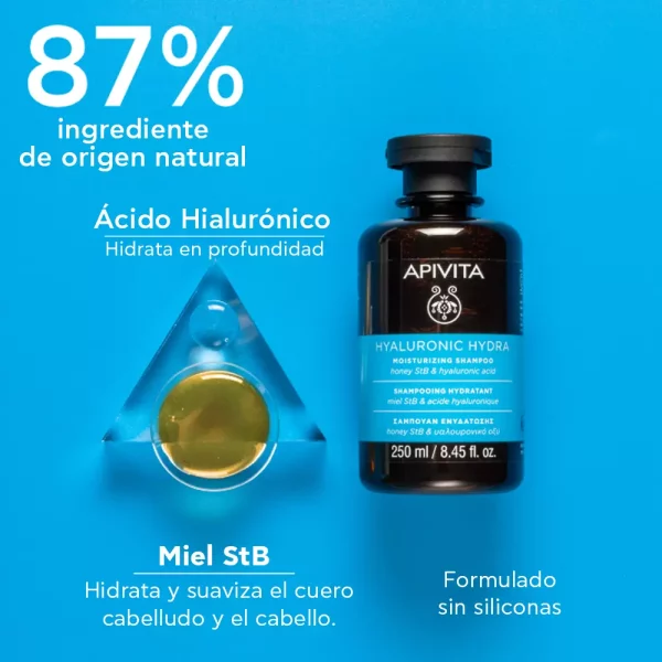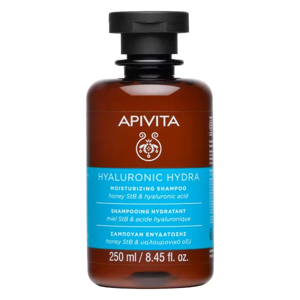 El shampoo Apivita Hyalu Hydra limpia suavemente, hidrata y fortalece el cabello con ácido hialurónico y miel StB. Previene el frizz y deja el cabello flexible, brillante y perfumado.
