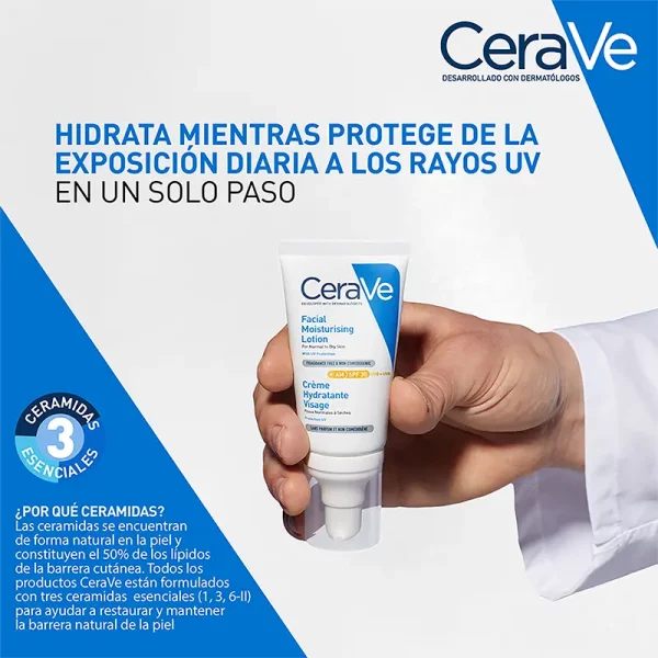 La Loción Hidratante de Rostro AM SPF30 de CeraVe hidrata, repara la barrera cutánea y protege del sol con 3 ceramidas esenciales, ácido hialurónico y niacinamida. Fórmula ligera, sin fragancias ni parabenos, ideal para pieles normales a secas.