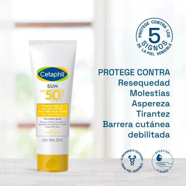 El Cetaphil Sun Oil Control FPS 50+ Ultra Mate combina muy alta protección solar de amplio espectro con un acabado estético perfecto para pieles mixtas y grasas. Gracias a sus tecnologías Solar Care Intelligence y Face Technology, protege la piel frente a los rayos UVA/UVB, combate el daño oxidativo y controla el exceso de grasa hasta por 12 horas.