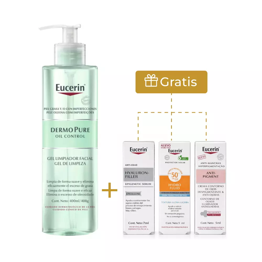 Kit Eucerin: Gel Facial DermoPure 400ml + Hydro Fluid 5ml + Contorno AntiPigment 5ml + Hyaluron Filler 5ml