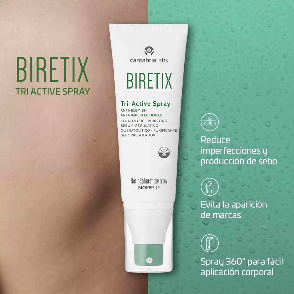 • Biretix TriActive Spray (100 ml): tratamiento con ácido glicólico, ácido salicílico, niacinamida y retinoides encapsulados que mejora la textura de la piel, ayuda a controlar imperfecciones y previene la obstrucción de los poros.