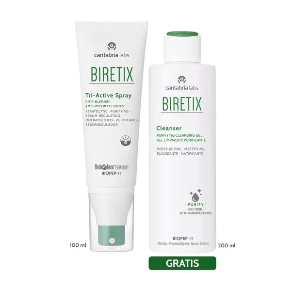 Kit Biretix TriActive Spray 100 ml con regalo Cleanser Gel 200 ml. Rutina para piel grasa que controla imperfecciones, limpia profundamente y mejora la textura con ácidos exfoliantes y calmantes.