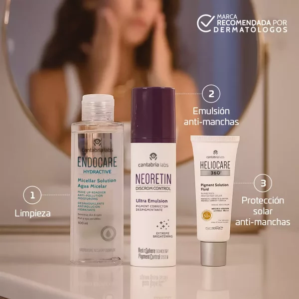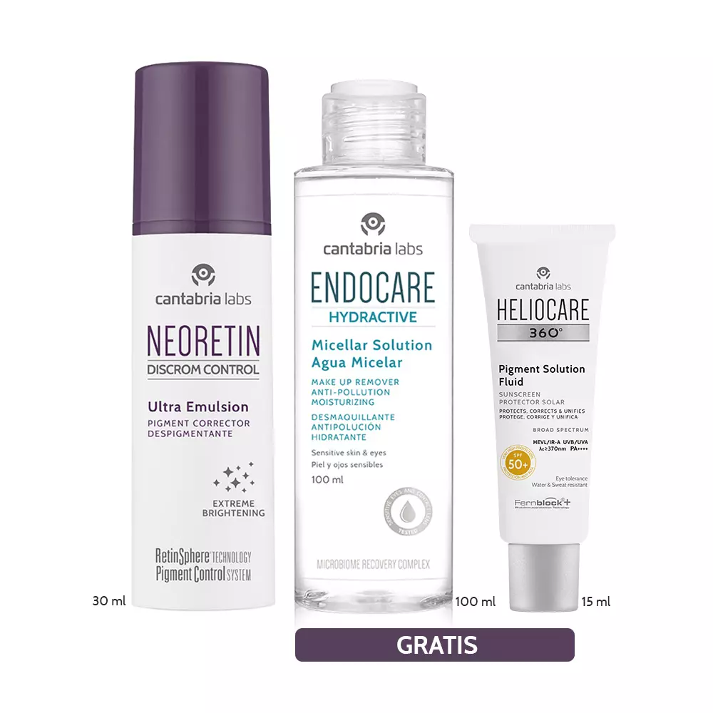 Kit Neoretin Ultra Emulsión 30 ml con regalos Hydractive Micelar 100 ml y Heliocare Pigment Solution 15 ml. Rutina antimanchas avanzada que reduce pigmentaciones, limpia, hidrata y protege del sol.