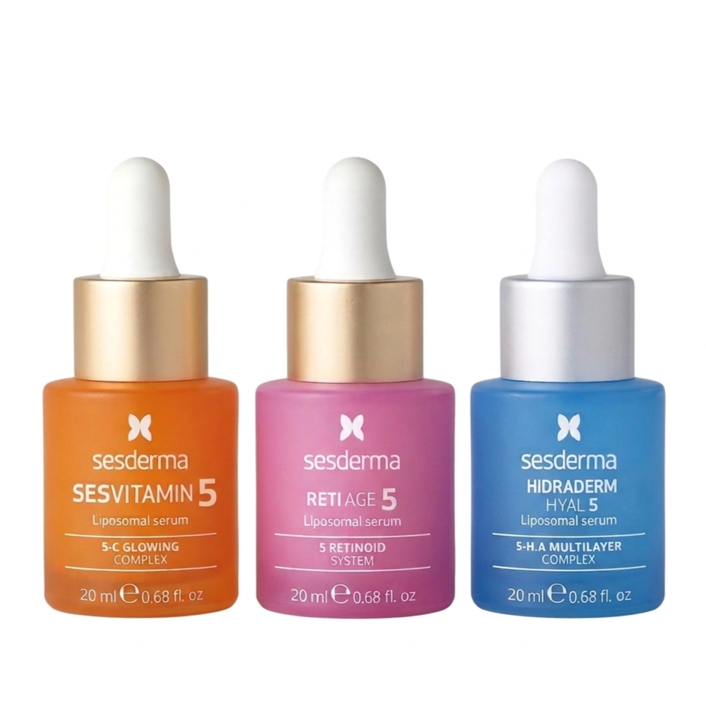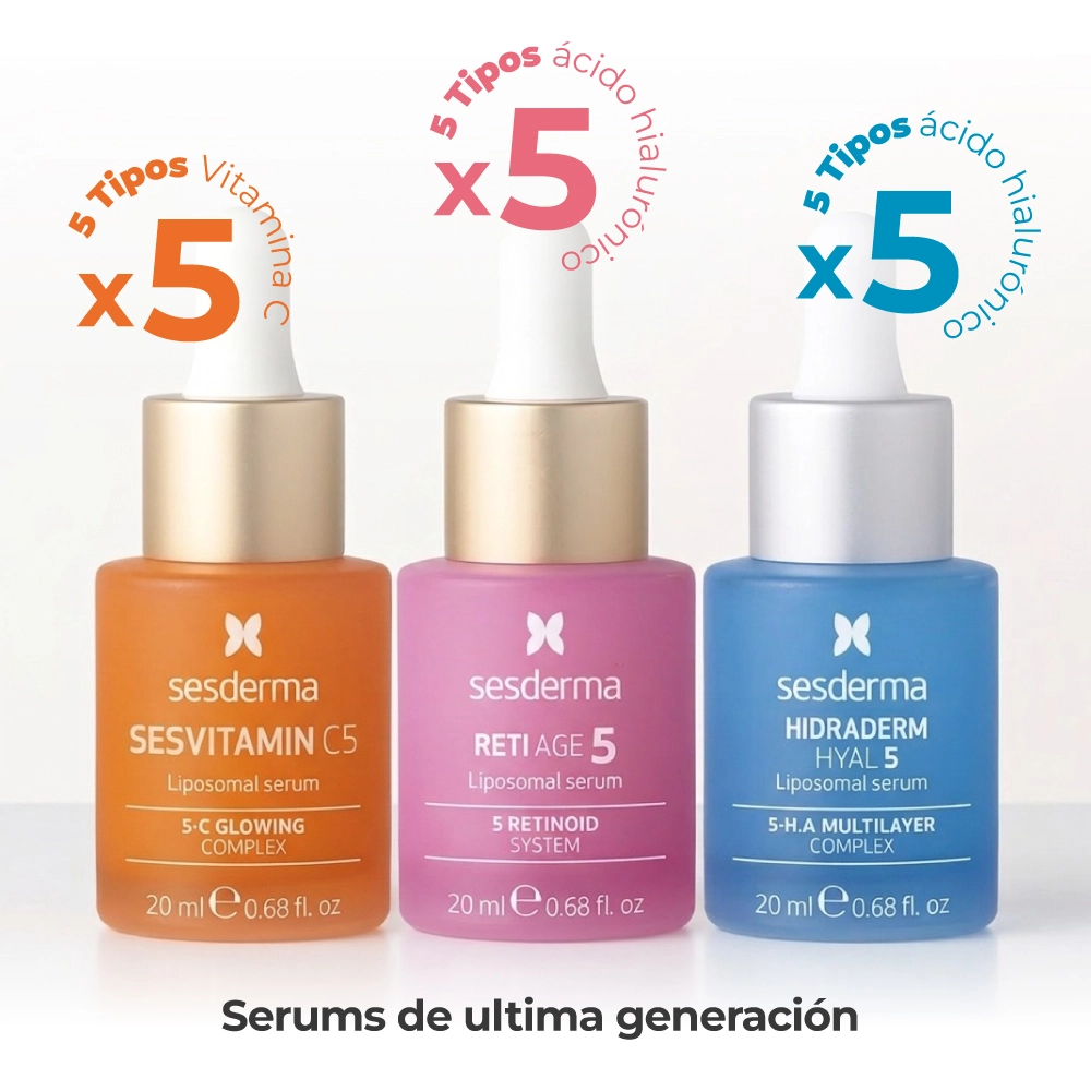 Potencia tu rutina con el Kit El Poder del 5 de Sesderma. Incluye 3 mini sérums (20ml c/u) con fórmulas liposomadas: Sesvitamin-C para dar luz, Reti Age para renovar y Hidraderm Hyal para hidratar profundamente. ¡Resultados visibles en un solo pack!