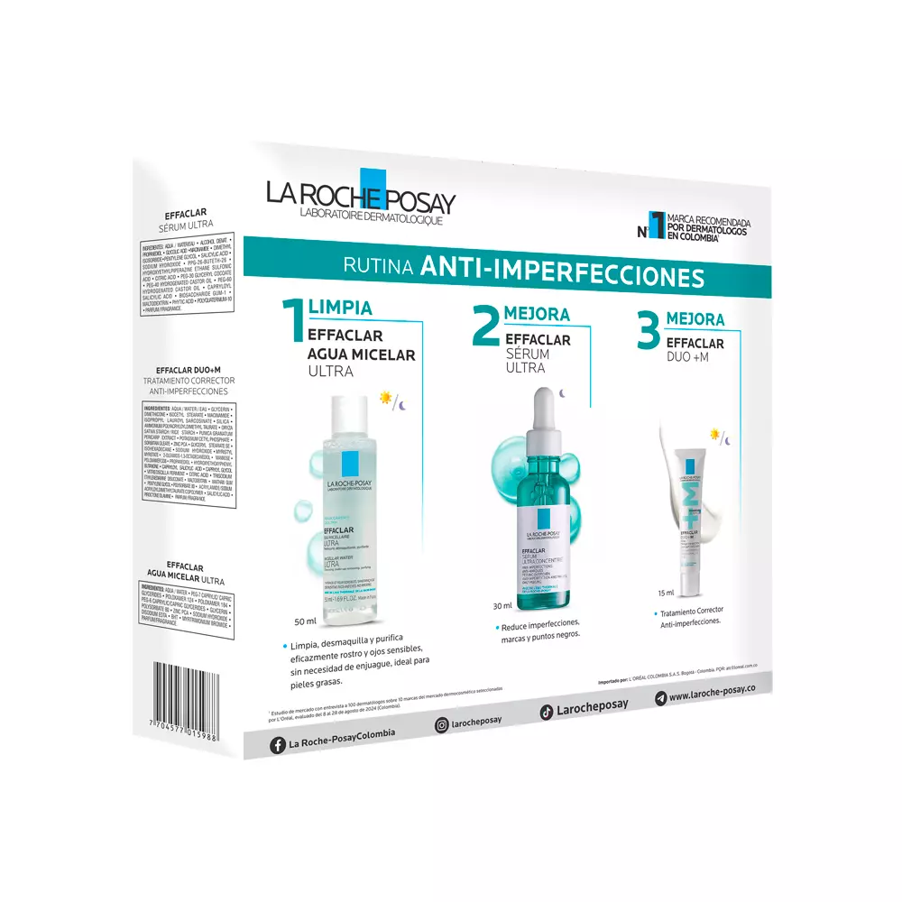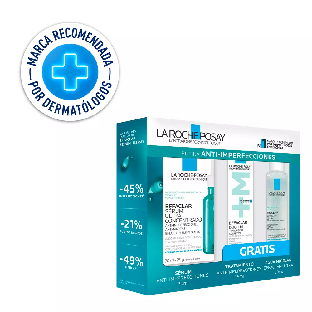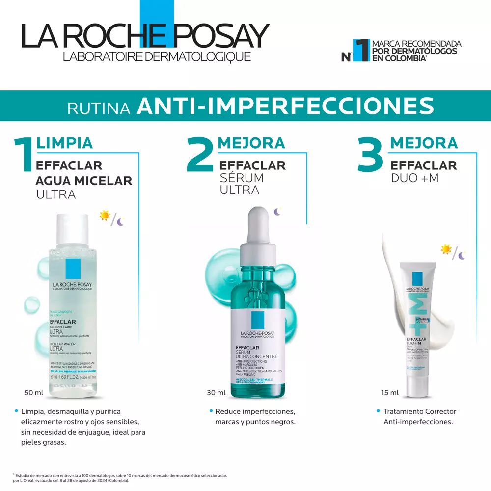 Aplicar el Agua Micelar para limpiar el rostro. Seguir con el Serum Ultra por la noche y finalizar con Effaclar Duo +M para una hidratación correctiva. Se recomienda el uso diario de protección solar.