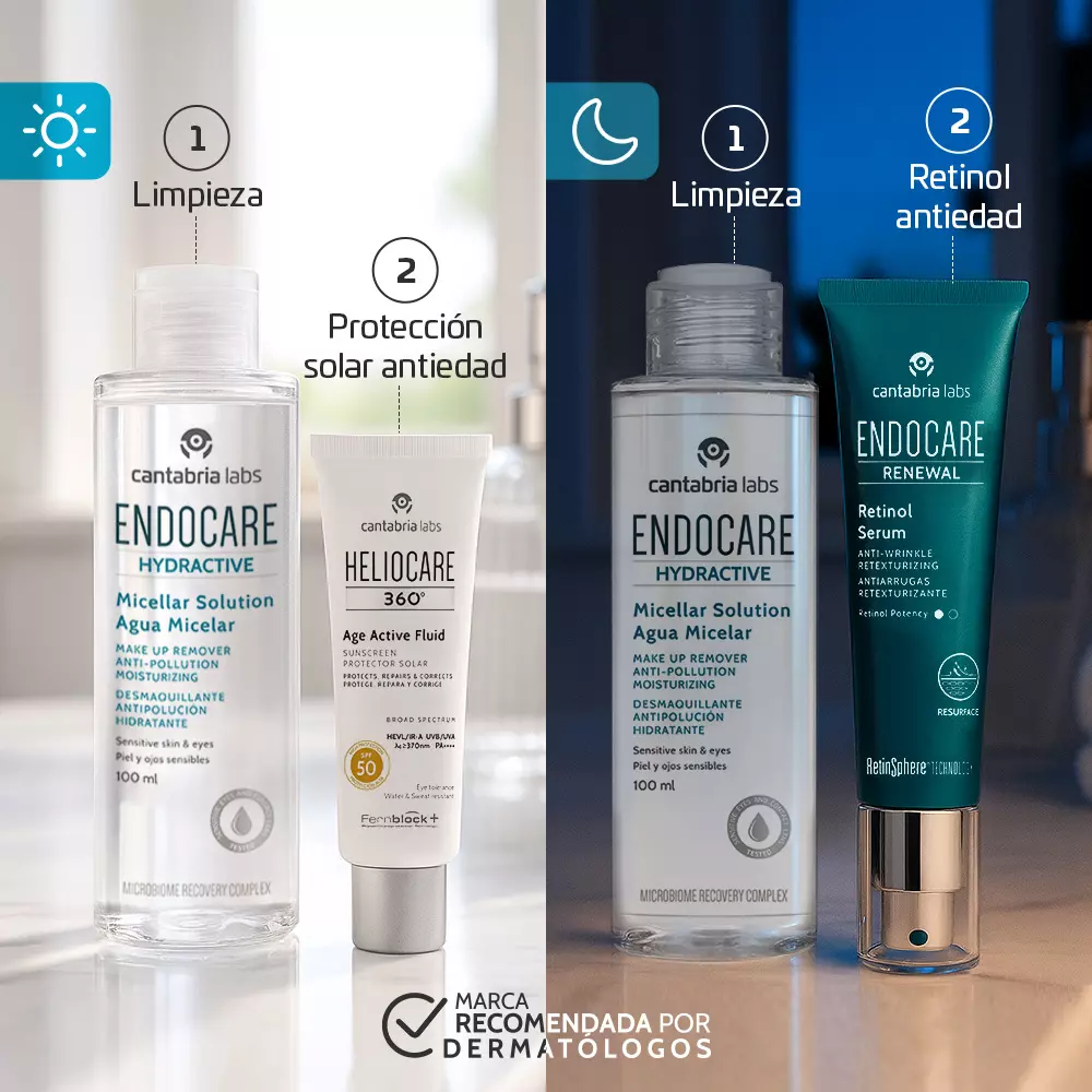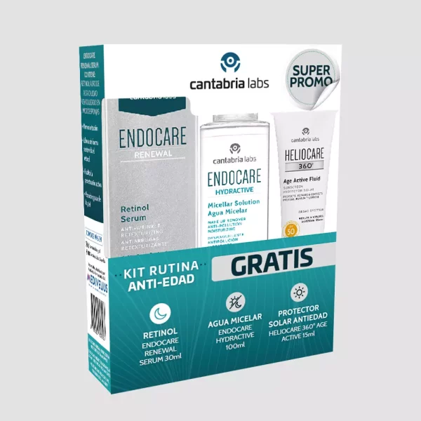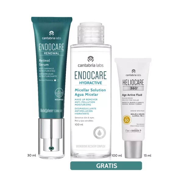 Kit Endocare Renewal Sérum 0.2% con regalos Hydractive Micelar 100 ml y Heliocare Age Active 15 ml. Rutina antiedad completa que renueva, limpia y protege la piel frente a arrugas y sol.