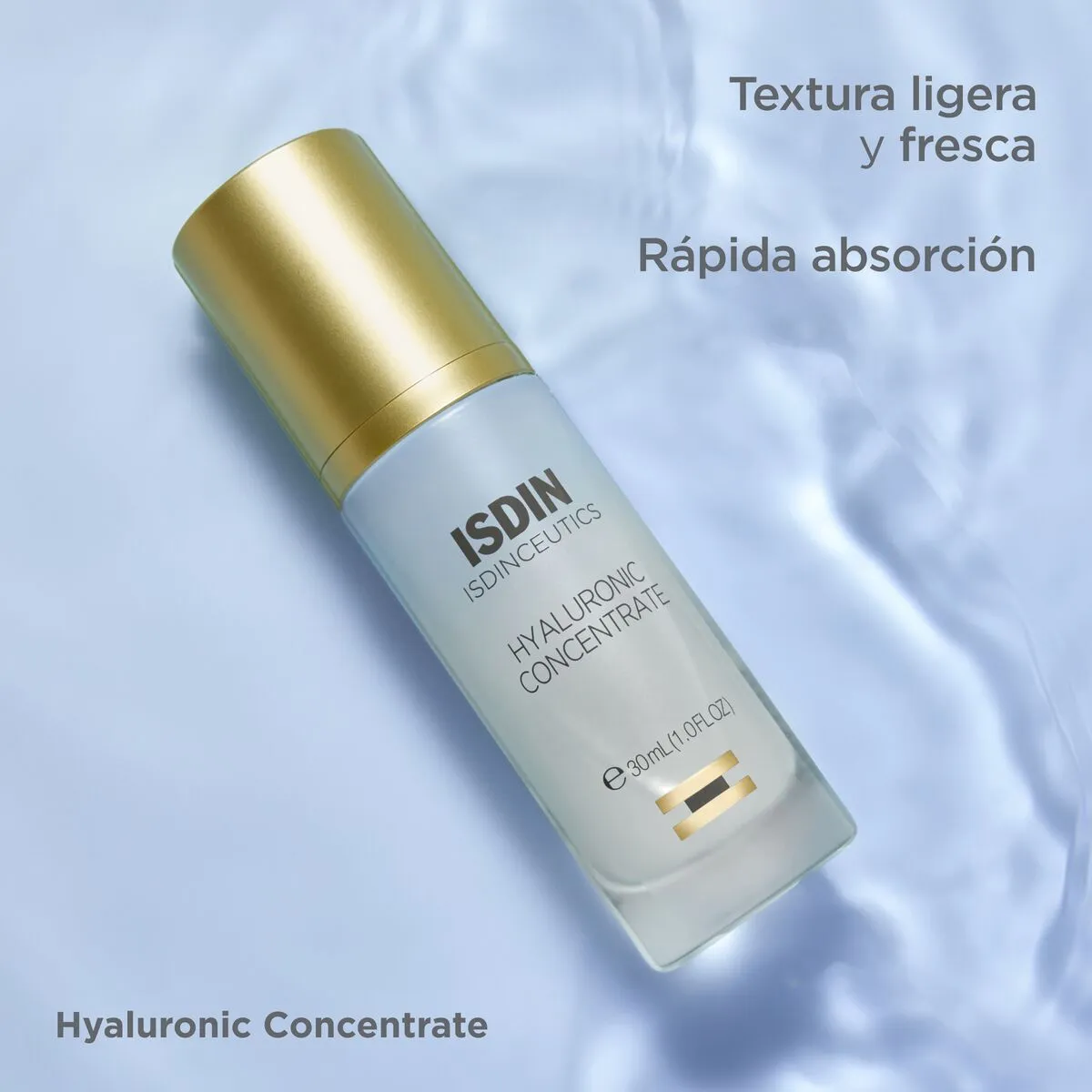 Isdinceutics Hyaluronic Concentrate es un sérum facial formulado con ácido hialurónico de peso medio y bajo, diseñado para hidratar intensamente y mejorar la apariencia de la piel. Su textura aqua-gel se absorbe al instante, dejando una sensación de frescura sin residuo pegajoso.