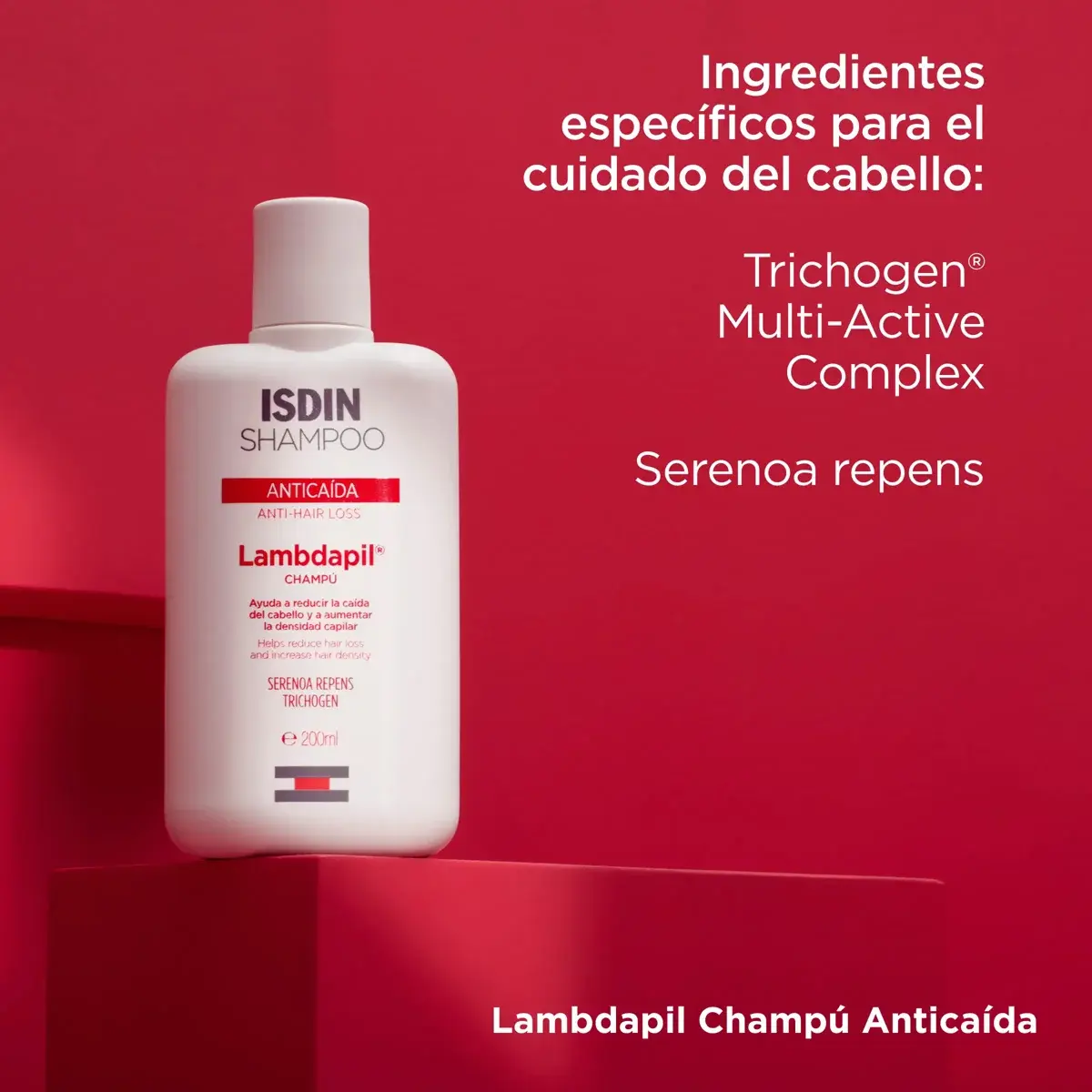 Isdin Lambdapil Champú Anticaída ayuda a reducir la caída excesiva del cabello y a mejorar su densidad desde las primeras semanas de uso. Su fórmula fortificante con Serenoa repens y Trichogen® Multi-Active Complex revitaliza el cuero cabelludo, aportando fuerza, vigor y un aspecto más saludable.
