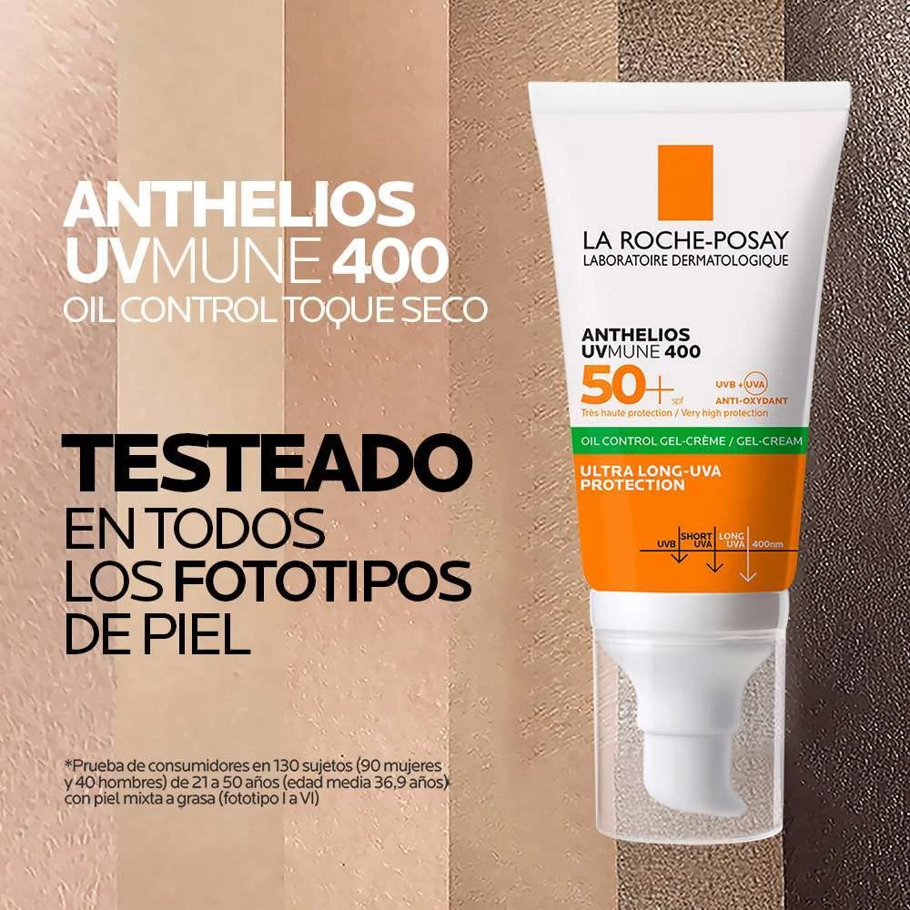 El Anthelios UVMune 400 Oil Control de La Roche-Posay está diseñado para ofrecer una fotoprotección cómoda, confiable y adaptada a las pieles con tendencia a brillo. Su fórmula incorpora la tecnología UVMune 400 con filtros de última generación que protegen frente a los rayos UVA ultra largos, considerados entre los más penetrantes y responsables del envejecimiento prematuro.