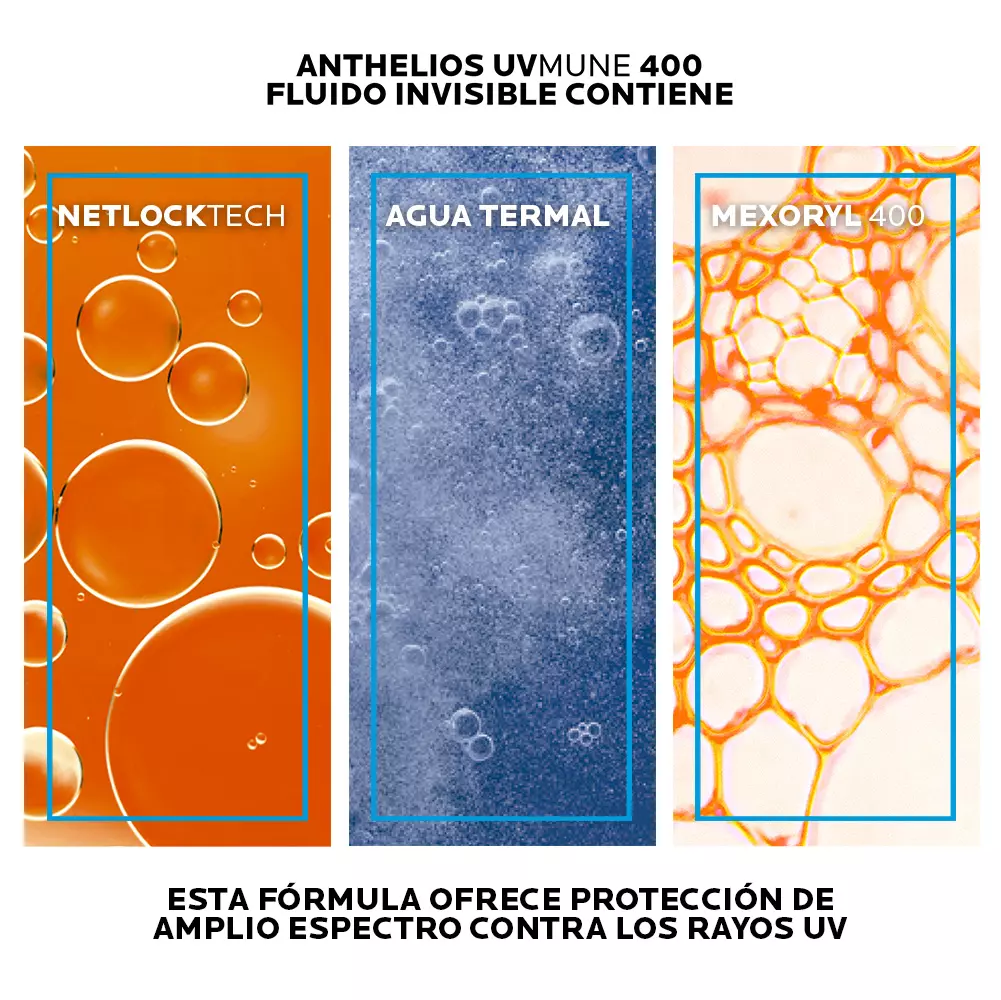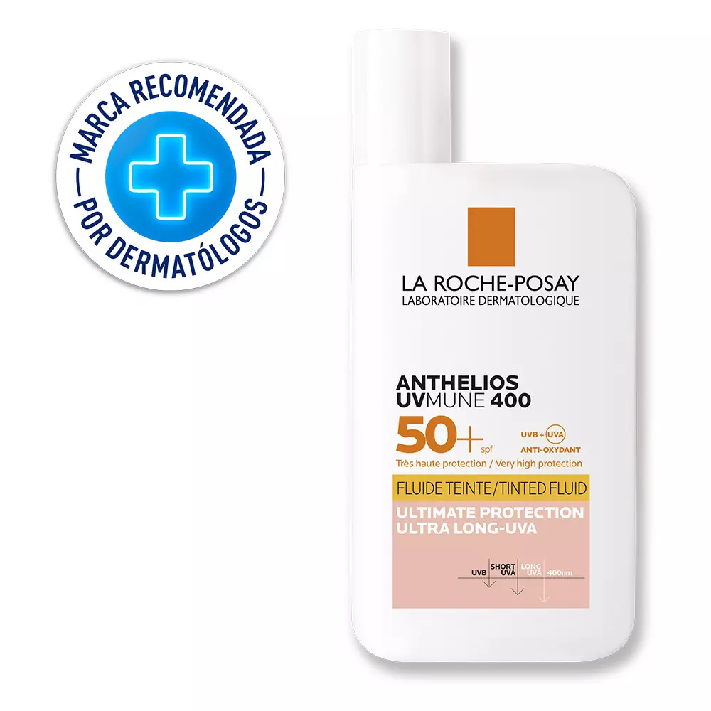 Anthelios UVMune 400 Fluido con color Invisible SPF 50+ Sin Perfume de La Roche-Posay ofrece una protección solar avanzada de amplio espectro frente a rayos UVB, UVA y UVA ultra-largos (hasta 400 nm), gracias a su innovador filtro Mexoryl 400. Esta fórmula está especialmente diseñada para pieles sensibles y reactivas.