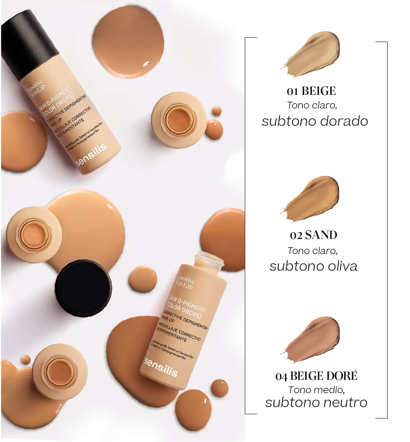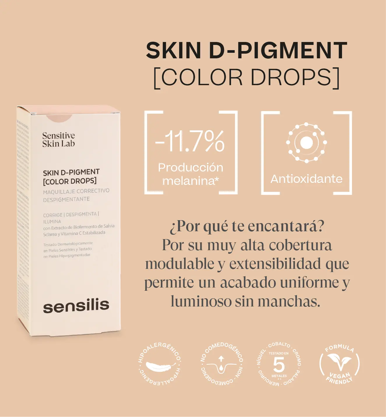 El Sensilis Skin D-Pigment [Color Drops] Tono 2 Sand es un maquillaje dermatológico fluido de alta cobertura y acabado natural, diseñado para disimular imperfecciones y aportar luminosidad inmediata al rostro. Su textura ligera y anhidra se funde con la piel, brindando un acabado uniforme y confortable durante todo el día.