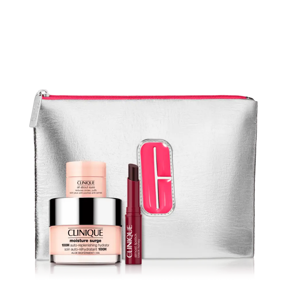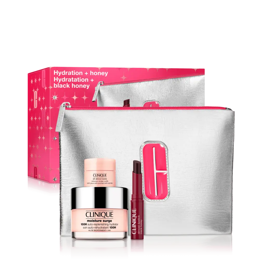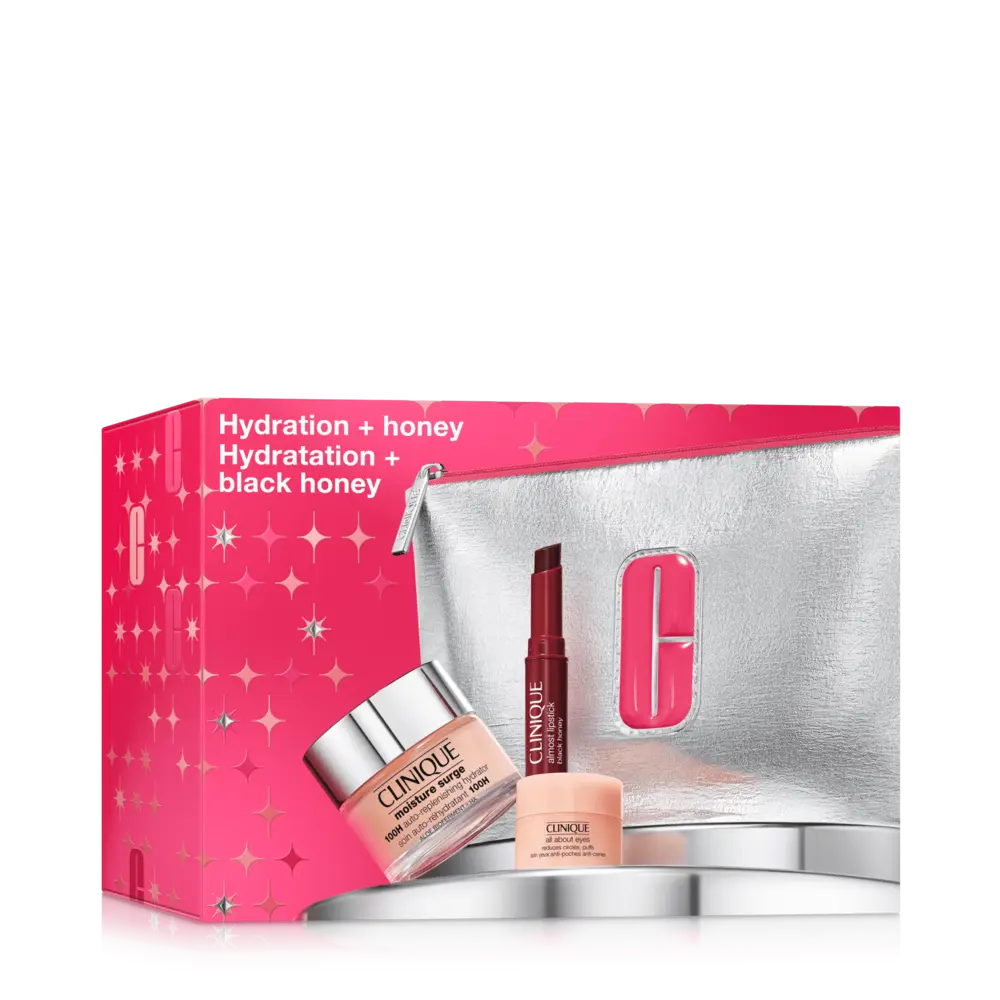 Clinique Hydration + Honey Set es un trío esencial que combina hidratación avanzada y color natural. Incluye el reconocido Moisture Surge™ 100H Auto-Replenishing Hydrator, el contorno de ojos All About Eyes™ y el icónico labial Almost Lipstick en tono Black Honey.