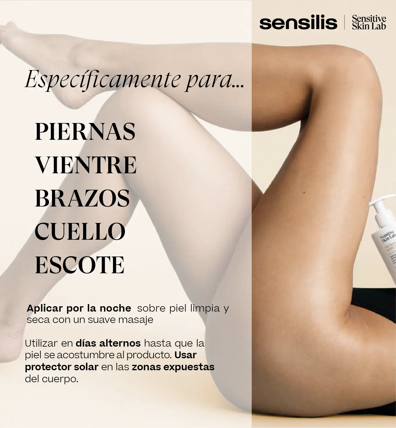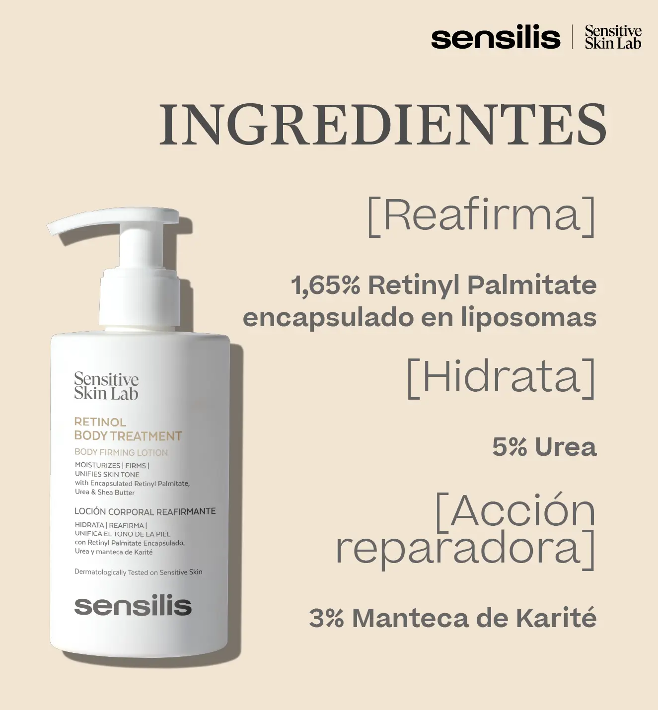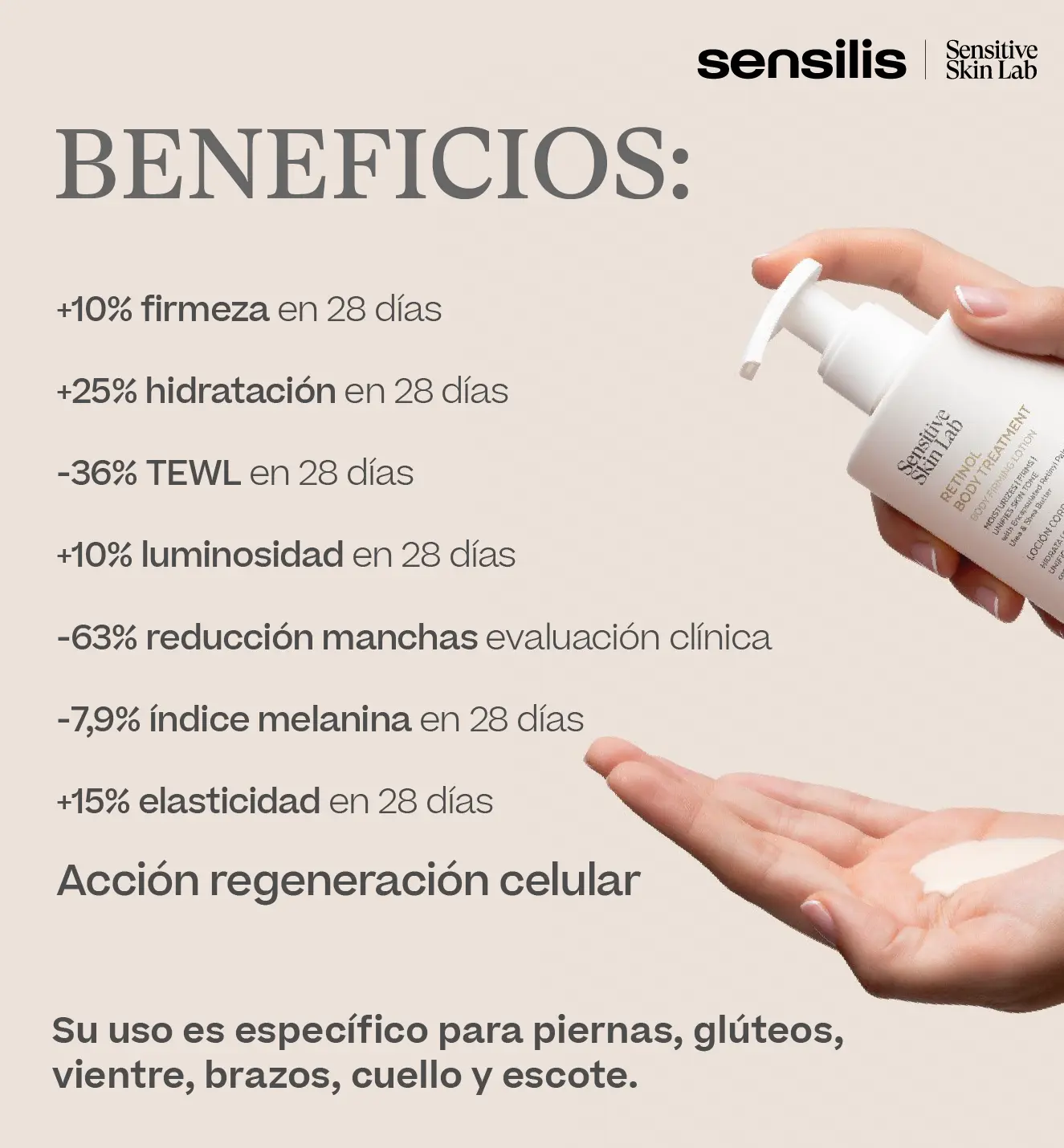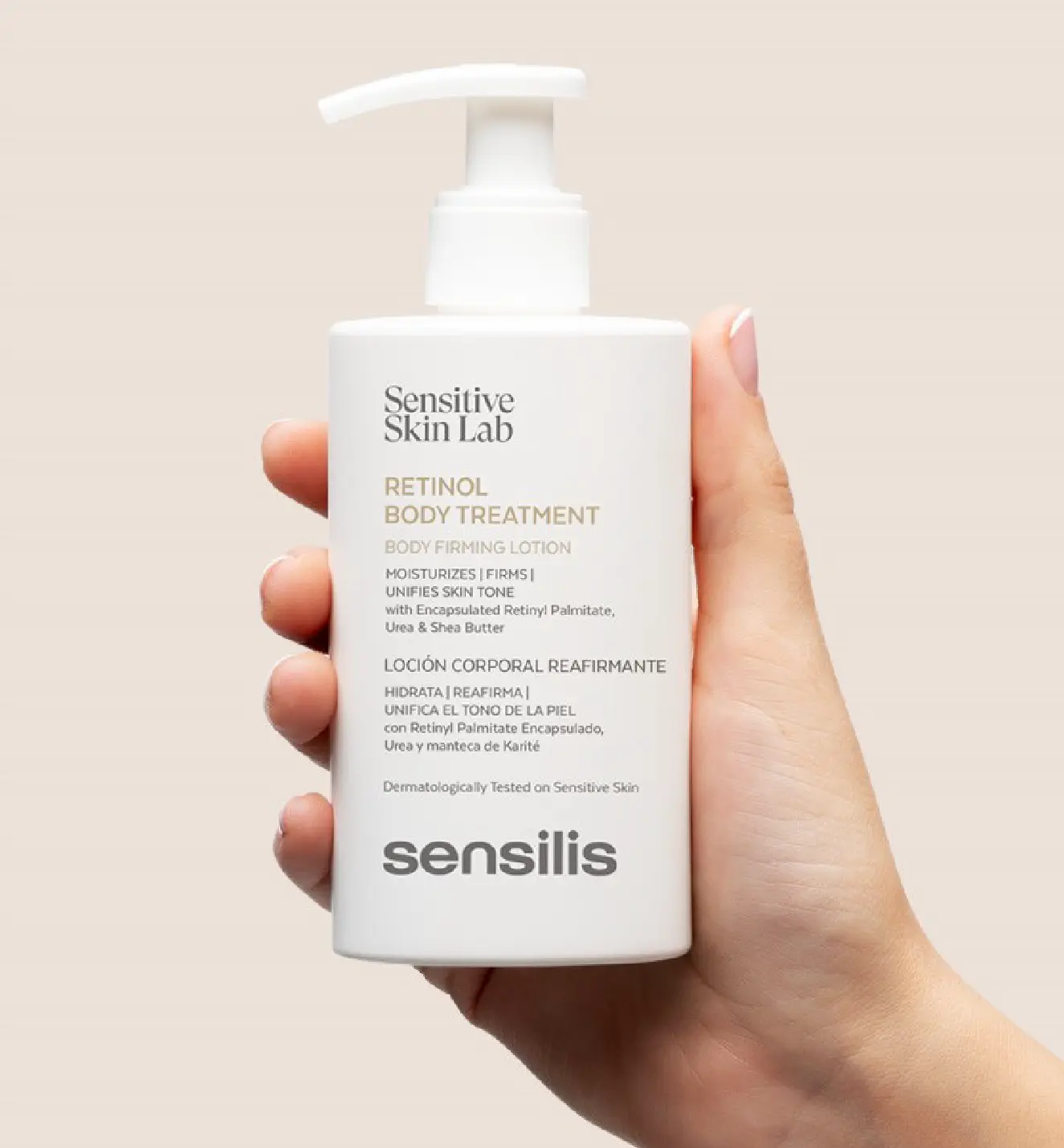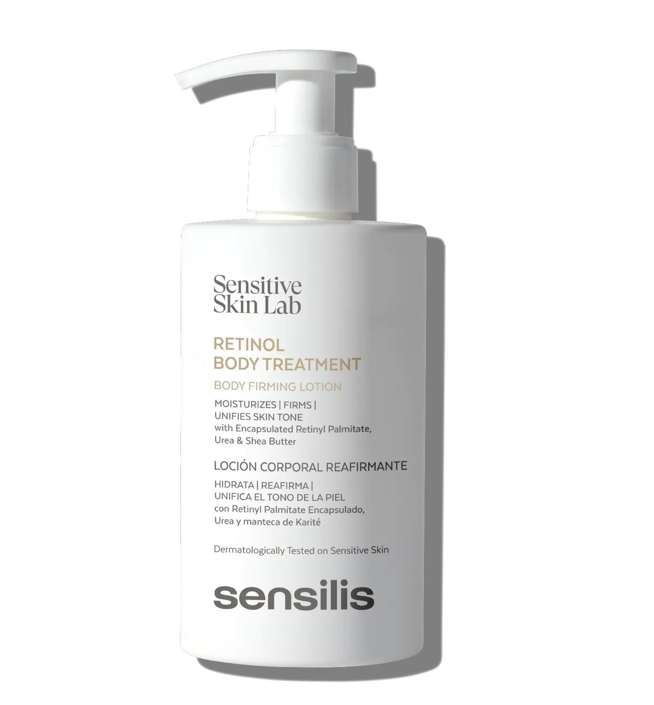 La Sensilis Retinol Body Treatment es una loción corporal de textura ligera y rápida absorción que combina eficacia antiedad, hidratación profunda y acción reafirmante. Su fórmula con retinol encapsulado en liposomas estimula la renovación celular para mejorar la firmeza y la textura de la piel, ayudando a reducir visiblemente arrugas y manchas.