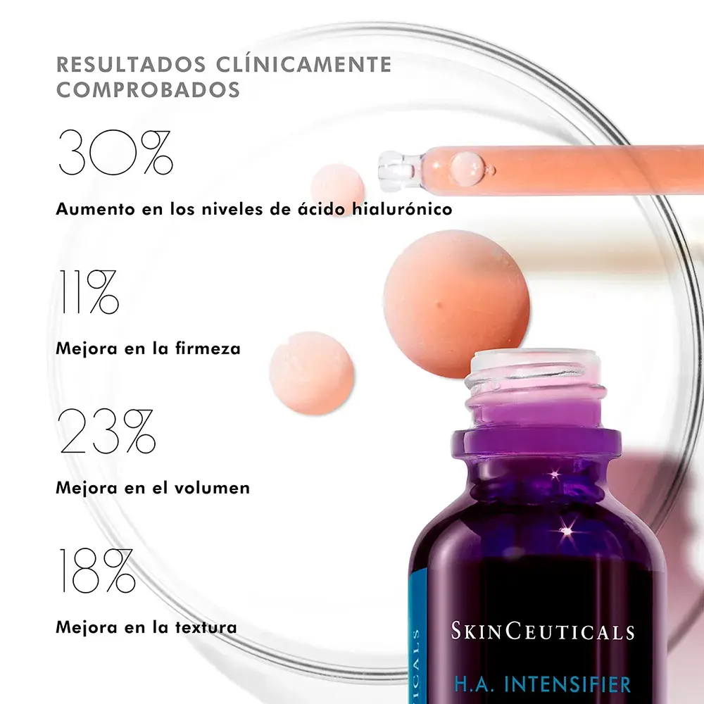 Sérum H.A Intensifier (30 ml) que aumenta los niveles de ácido hialurónico en la piel hasta en un 30%. Mejora el volumen, firmeza y suavidad, proporcionando hidratación duradera. Ideal para áreas con pérdida de volumen como ojos y labios. Apto para todo tipo de piel.