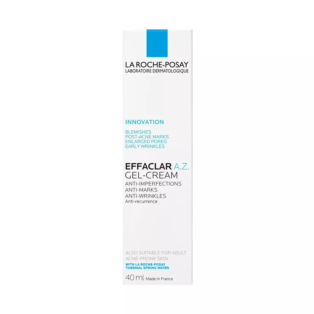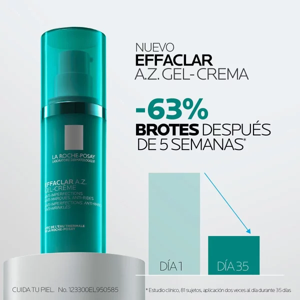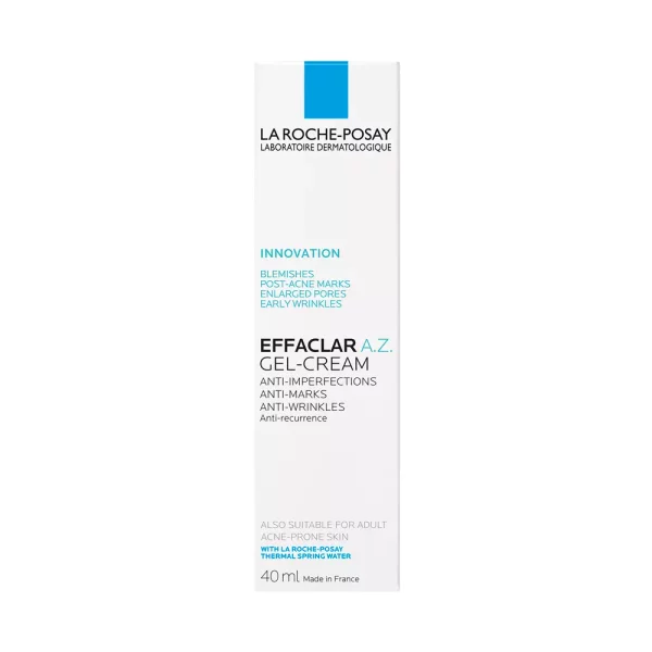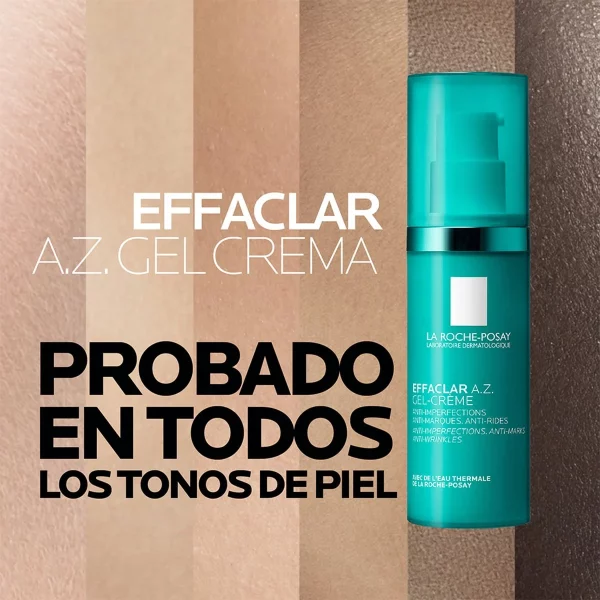 La Roche-Posay Effaclar A-Z Gel-Crema es un tratamiento dermatológico desarrollado para piel adulta con tendencia a imperfecciones. Su fórmula combina ácido azelaico, ácido salicílico y ácido hialurónico para actuar en varios frentes: corrige imperfecciones, minimiza manchas post-imperfecciones, reduce líneas finas y mejora la textura de la piel.
