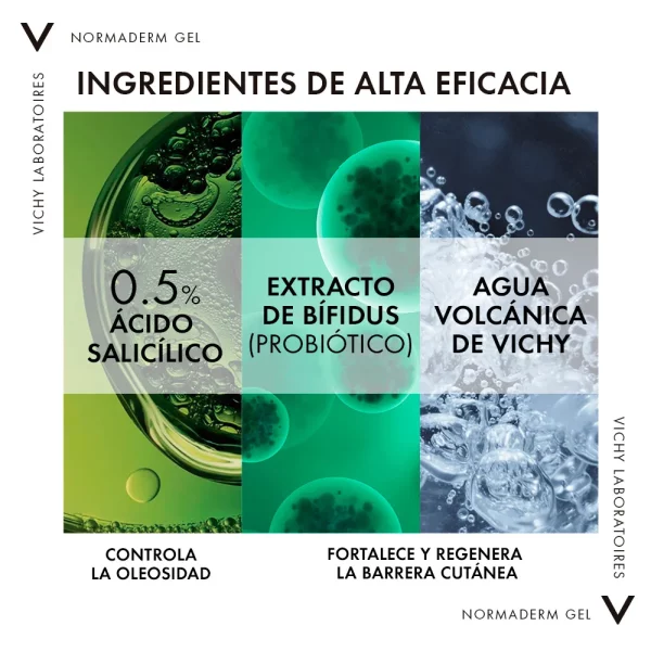 Gel limpiador purificante para pieles mixtas a grasas. Enriquecido con ácido salicílico, zinc y agua volcánica de Vichy para reducir imperfecciones y minimizar poros.